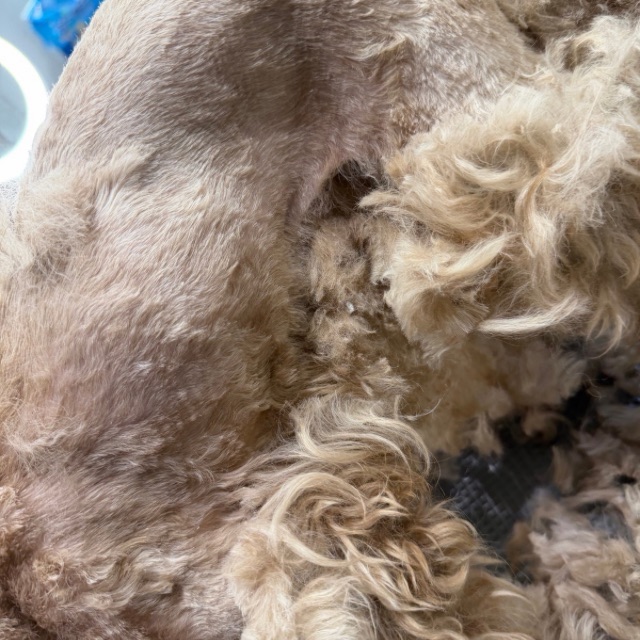 これでもわかりにくいですがもつれてない場合は皮膚がみえるのと毛が束にならないです。